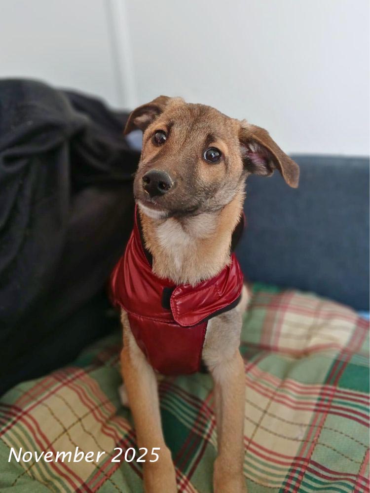 Angie is een van 11 pups die samen gevonden zijn en is (samen met Brad) de laatste die nog een enkeltje naar Nederland zocht, alle andere pups hadden al een gastgezin of adoptant gevonden. Gelukkig zijn nu ook deze twee pups veilig, vlak voor de kerst. De komende periode mag ze rustig bijkomen van alle nieuwe indrukken. Wanneer ze beschikbaar komt ter adoptie zal haar pagina uitgebreid aangevuld worden.