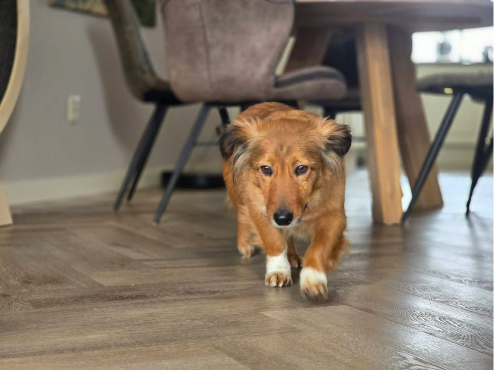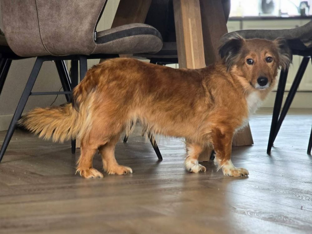 Formaat: kleine middenmaat hond, ongeveer 35 cm schofthoogte, 14,5 kilo