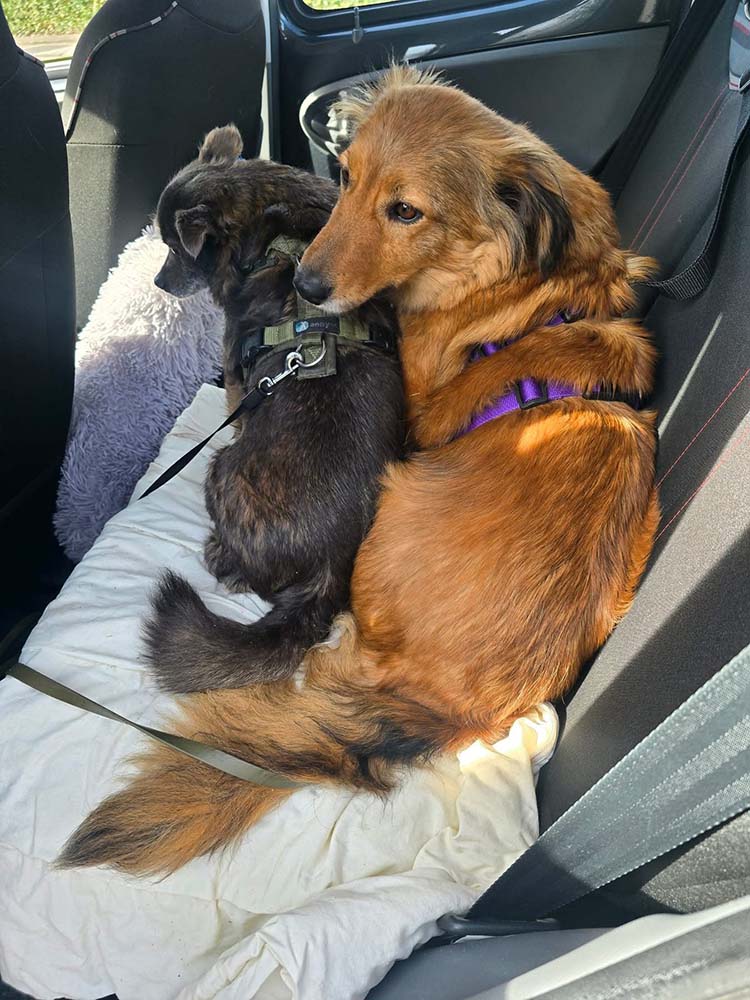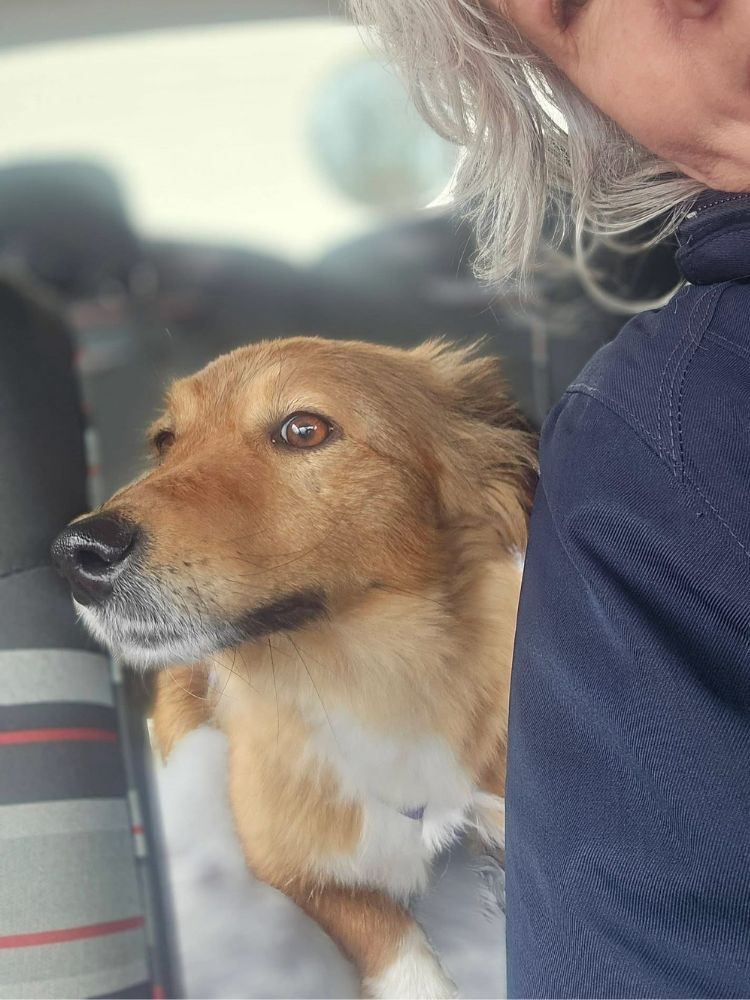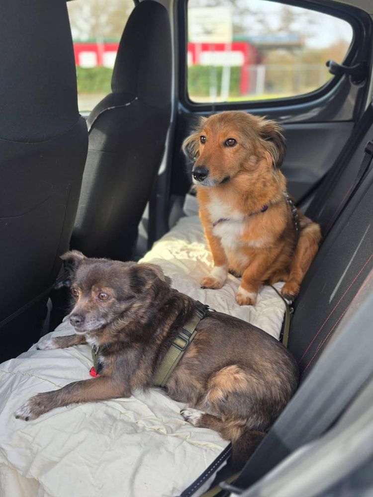 Met andere honden is ze zeer sociaal, soms daagt ze zelfs voorzichtig uit tot spel. Al met al een heel lief, zachtaardig hondje dat met veel geduld, rust en tijd een prachtig huisgenootje zou kunnen worden.