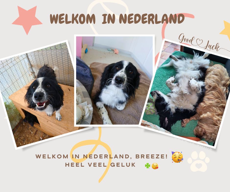 Gelukkig hoefde Breeze niet heel erg lang in het asiel te blijven: ze kon terecht bij één van onze ervaren gastzinnen, in Froombosch, provincie Groningen, waar ze vanaf 26 september 2025 verblijft. Ze zal langere tijd nodig hebben voor ze beschikbaar komt voor adoptie. Ze is enorm lief, maar ook heel onzeker. Haar gastgezin begeleidt haar in haar eigen tempo, zodat ze geleidelijk aan steeds meer zelfvertrouwen en vertrouwen in de wereld krijgt.