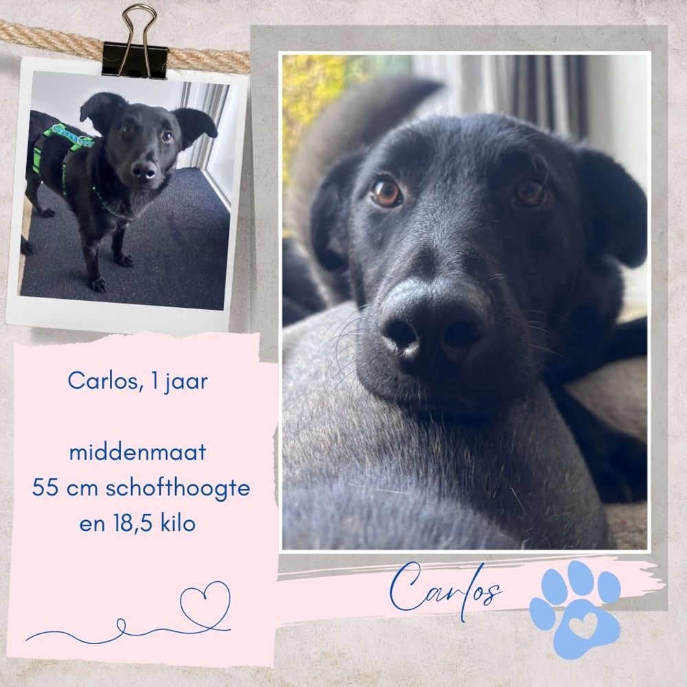 Carlos werd in januari samen met zijn moeder en nestgenootjes gevonden. Sindsdien verbleef hij in een privé asiel in Roemenië, wachtend op een gouden mandje. Helaas worden zwarte honden vaak over het hoofd gezien... Gelukkig zag een van onze gastgezinnen hem wel staan en heeft hem de kans op een beter leven gegeven. Carlos is bij hen gearriveerd op 15 september, in Drachten. In november deed zich een heel verdrietige situatie voor in Carlos' opvanggezin - Carlos zelf stond hier buiten. Na een noodoproep vonden we gelukkig een fijn ander gastgezin voor hem.