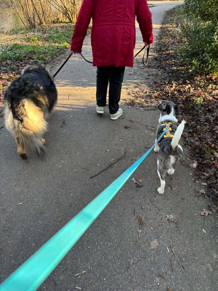 In de tuin is Indy heel onderzoekend, nieuwsgierig en speels. Geluiden die ze niet kent, kunnen soms nog wel indruk maken. Haar gastgezin heeft een beginnetje gemaakt met wandelen. Ook dan is Indy nieuwsgierig en onderzoekend. Onbekende mensen en honden tegenkomen is nu nog te spannend voor haar. Eerst moet ze een goede vertrouwensband ontwikkelen met haar begeleider/adoptant, en zich thuis en in een heel rustig wandelgebied helemaal veilig en ontspannen gaan voelen. Daarna kan er stapje voor stapje worden opgebouwd naar andere honden en onbekende mensen ontmoeten. Vanzelfsprekend is ons team graag bereid om adviezen te geven over het hoe en wanneer.