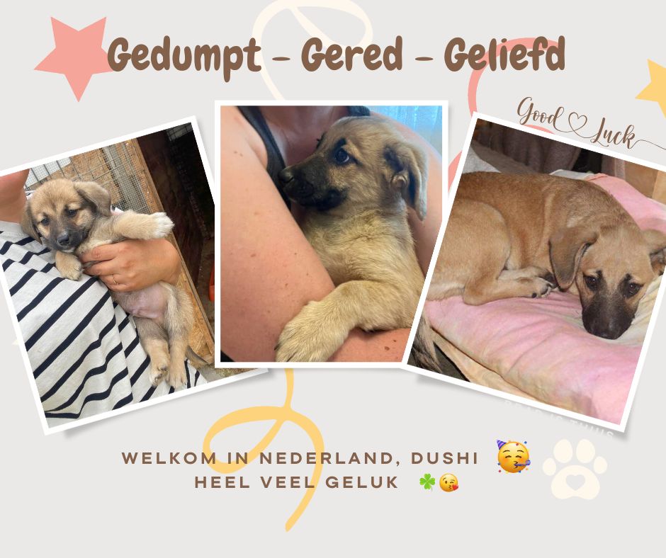 In mei en in juni 2025 is een aantal van onze teamleden een week lang op bezoek geweest bij het asiel van Elisa in Roemenië, waarmee we nauw samenwerken. Ze hebben heel veel pups en enkele volwassen hondjes leren kennen, door bij ze in de kennel te zitten, te spelen, te knuffelen en met ze te wandelen. Alleen de honden waarvan we verwachten dat ze gelukkig zullen worden in Nederland - en hun adoptanten met de hond - worden door ons bemiddeld. Pup Dushi hoort daar zeker bij!