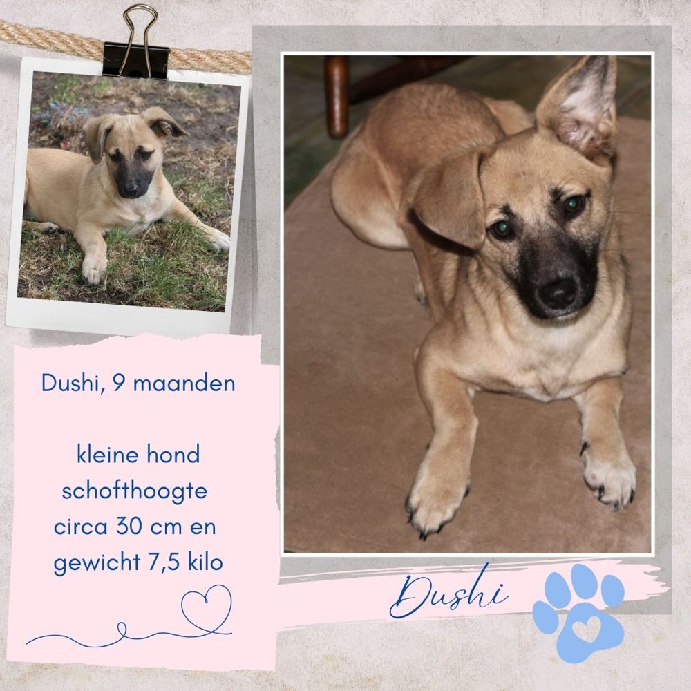 Dushi is een blije hond die het heerlijk vindt om in de tuin lekker te rennen en te spelen. Het aantrekken van het tuigje voor het wandelen vindt hij nog wat spannend, maar hij laat het wel toe. Waarschijnlijk zal dit minder worden wanneer hij het aantrekken van het tuigje gaat associëren met leuke dingen.