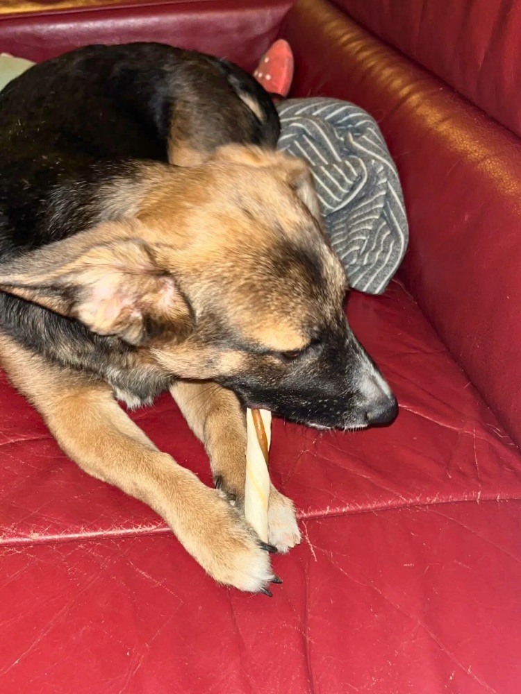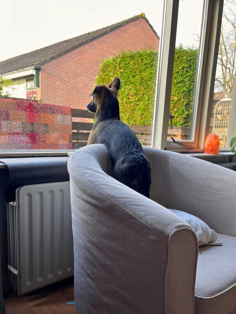 Fientje vindt even alleen thuis blijven nog moeilijk. In haar toekomstige thuis zal ze zich eerst helemaal veilig moeten voelen, daarna kan stapje voor stapje begonnen worden met even alleen zijn. Natuurlijk is ons team graag bereid om tips te geven!