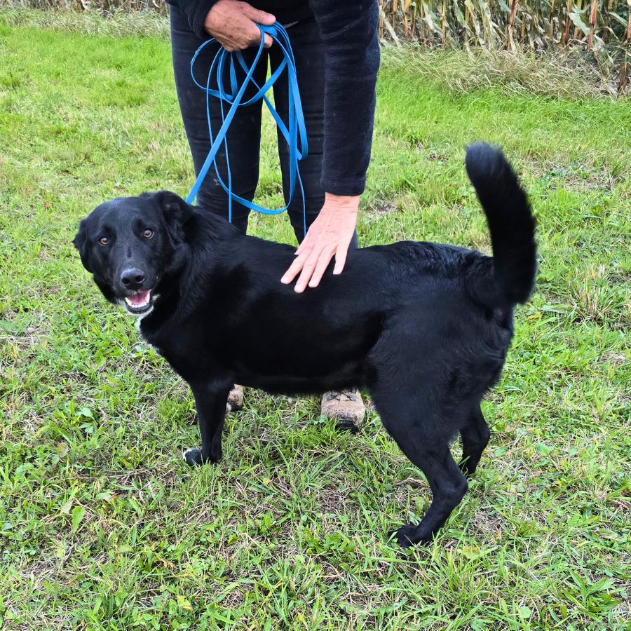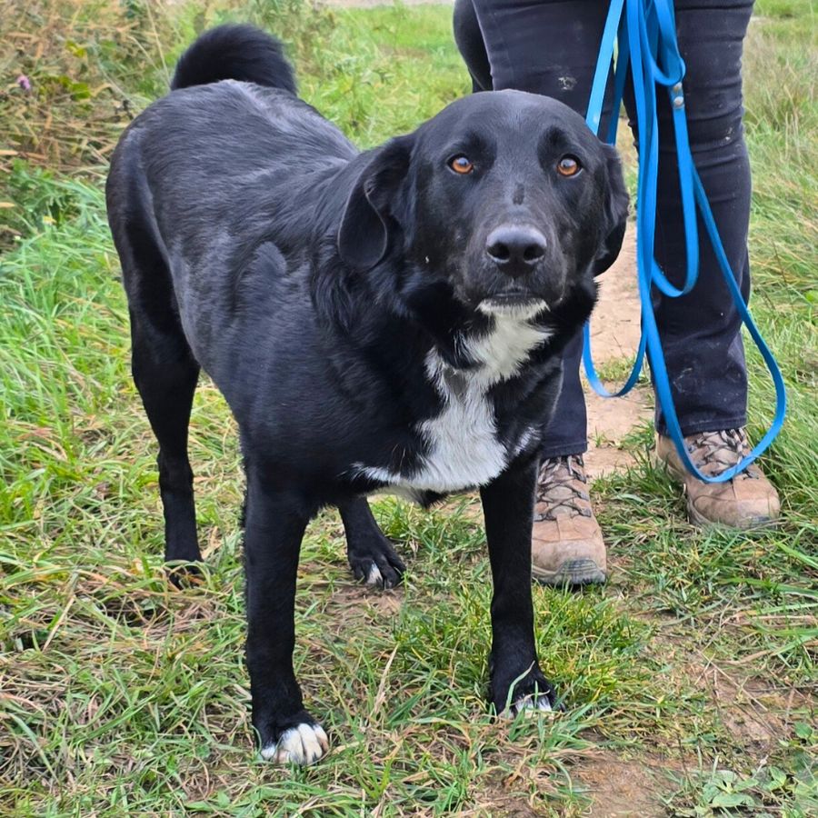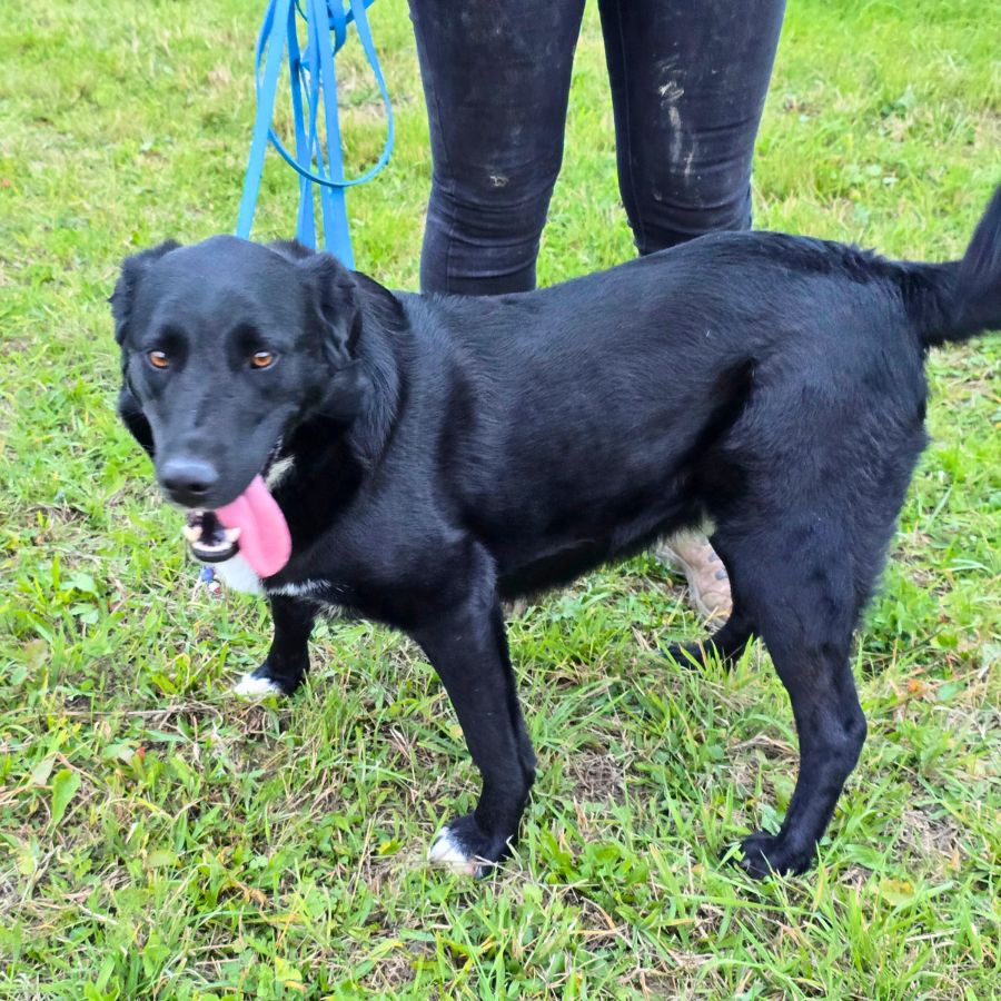 "Hij is een goedzak, enthousiast, mensgericht. Goed met honden, gek op eten en door een gebrek aan beweging ook wat kilootjes te zwaar. We hebben hem elke dag even mee uit wandelen genomen en worden dan vergezeld door zijn maatje Sacha, één van de loslopers hier. Finn vindt alles gezelllg, lijkt wat op een zwarte labrador. Niet bang, wel onstuimig. Hij zal geen probleem hebben met kinderen denken we, maar door zijn postuur en enthousiasme raden we te kleine kinderen af.