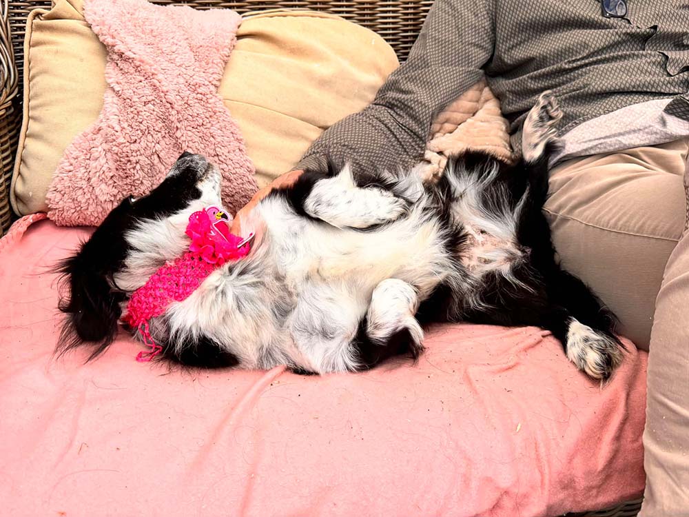 Freya kan inmiddels eventjes alleen zijn, ze gaat dan ergens liggen slapen. Dit zal in een nieuwe omgeving uiteraard eerst weer langzaam moeten worden opgebouwd. Ze is geen bench gewend. Freya speelt (nog) niet maar geniet intens van aandacht, kauwsnacks en comfortabele slaapplekjes.