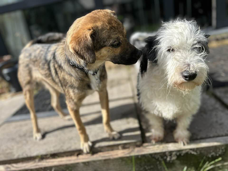 We namen je mee voor een wandeling en je huppelde vrolijk van links naar rechts. Geen seconde onder de indruk terwijl je normaal nooit buiten het asiel komt. Je begroette de andere reu die meeging alsof hij je beste vriend was, snuffelde dat het een lust was en kwam steeds weer knuffels halen bij ons.