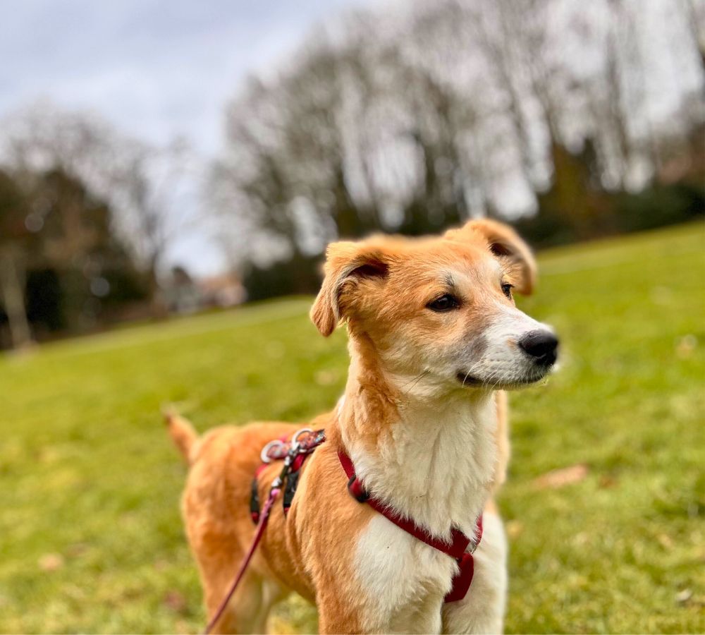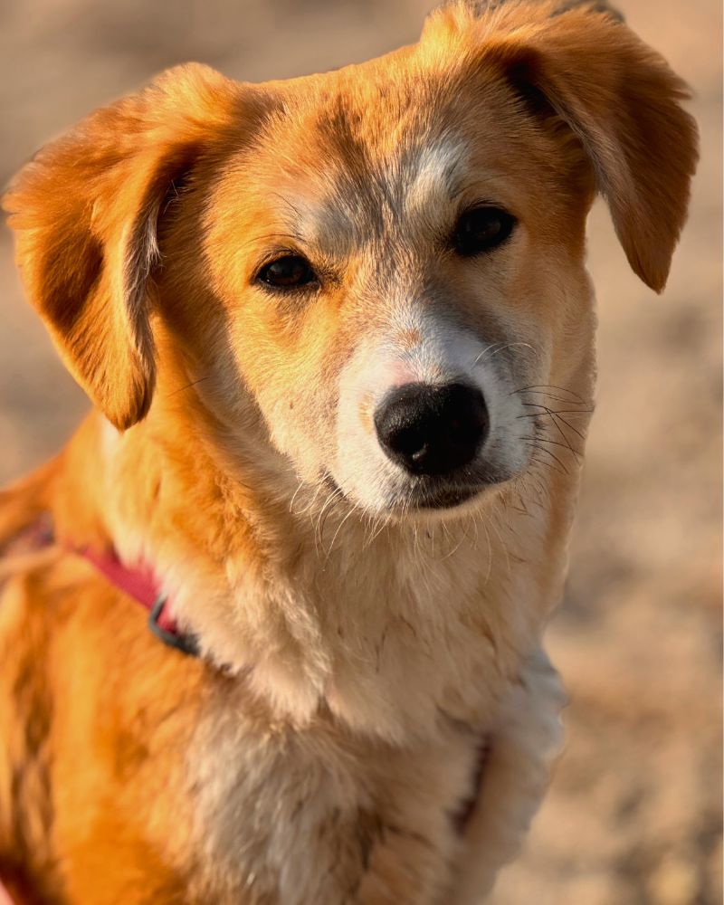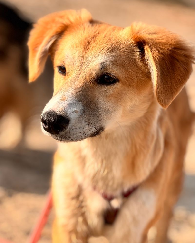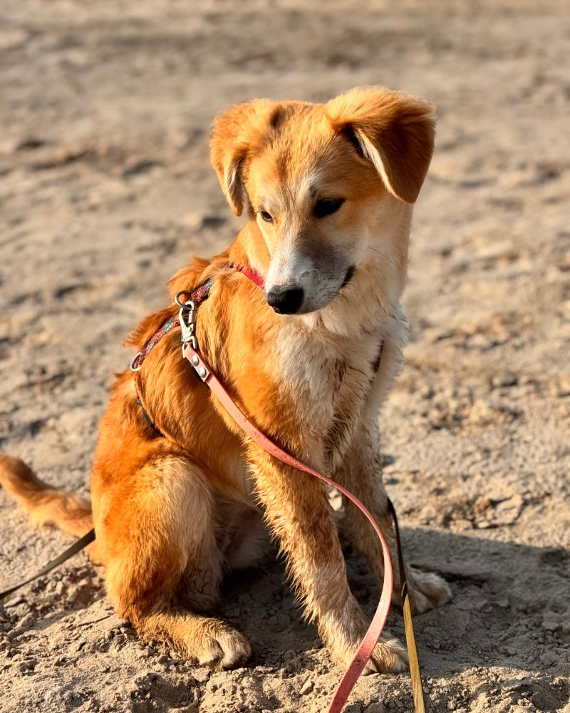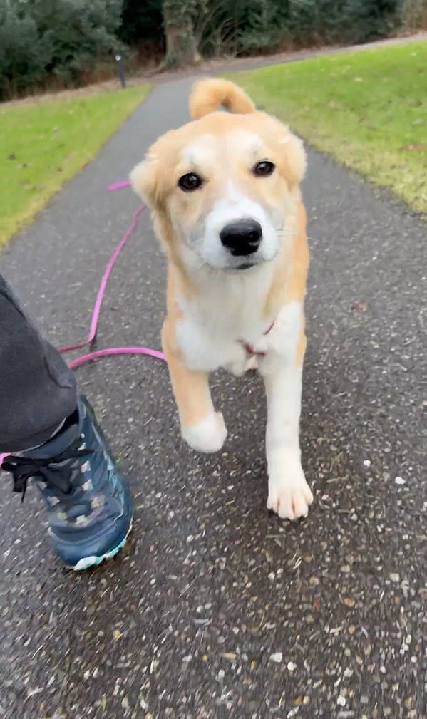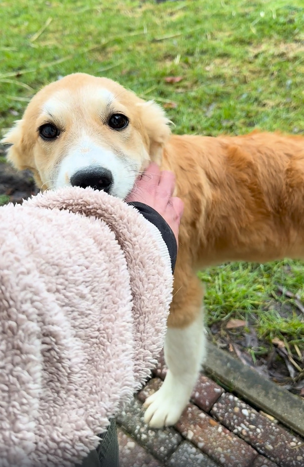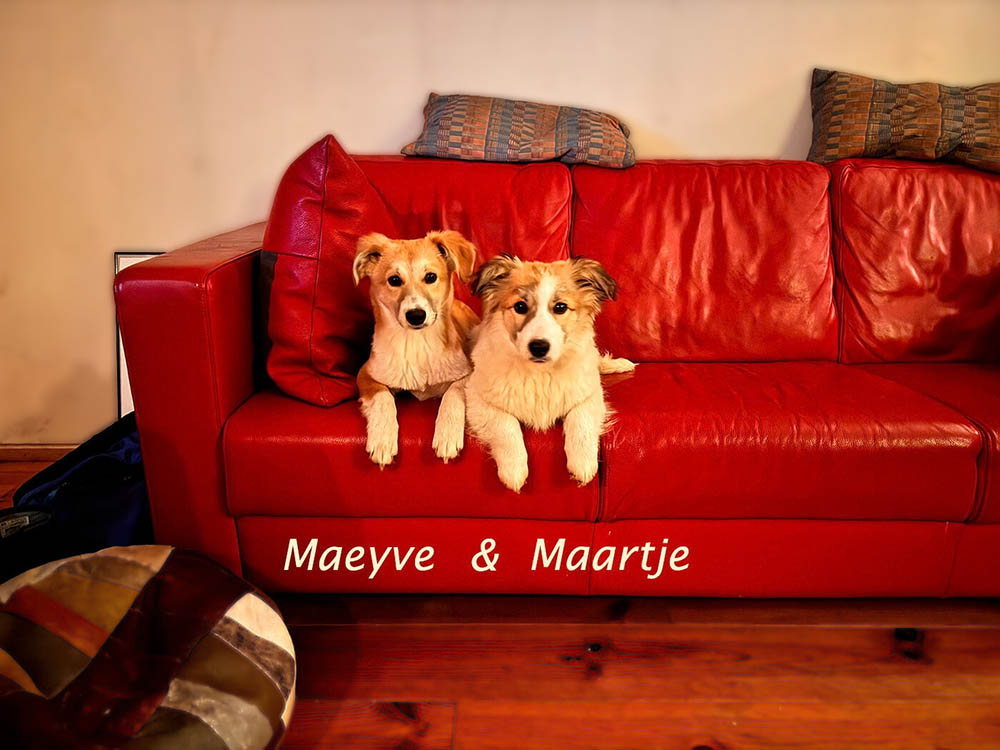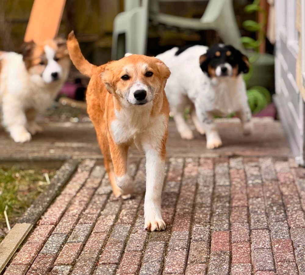 Tijdens ons asielbezoek waren de pups van Annie in eerste instantie afwachtend. Ze hebben veel aandacht gekregen en dat had resultaat: elke dag werden de pups een stukje zelfverzekerder in het contact. Dat geldt zeker voor Maeyve. Ze is ontzettend vrolijk en onderzoekend, maar aan de andere kant ook wat handschuw. In de kennel bleef ze een beetje op afstand, tijdens de wandeling werd dat beter.