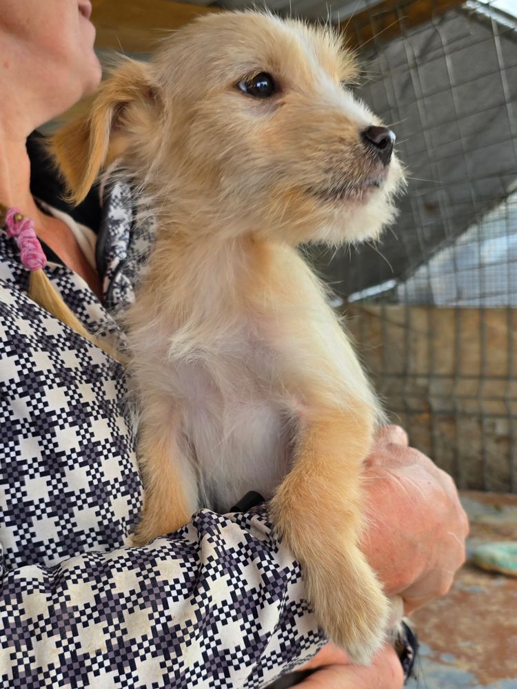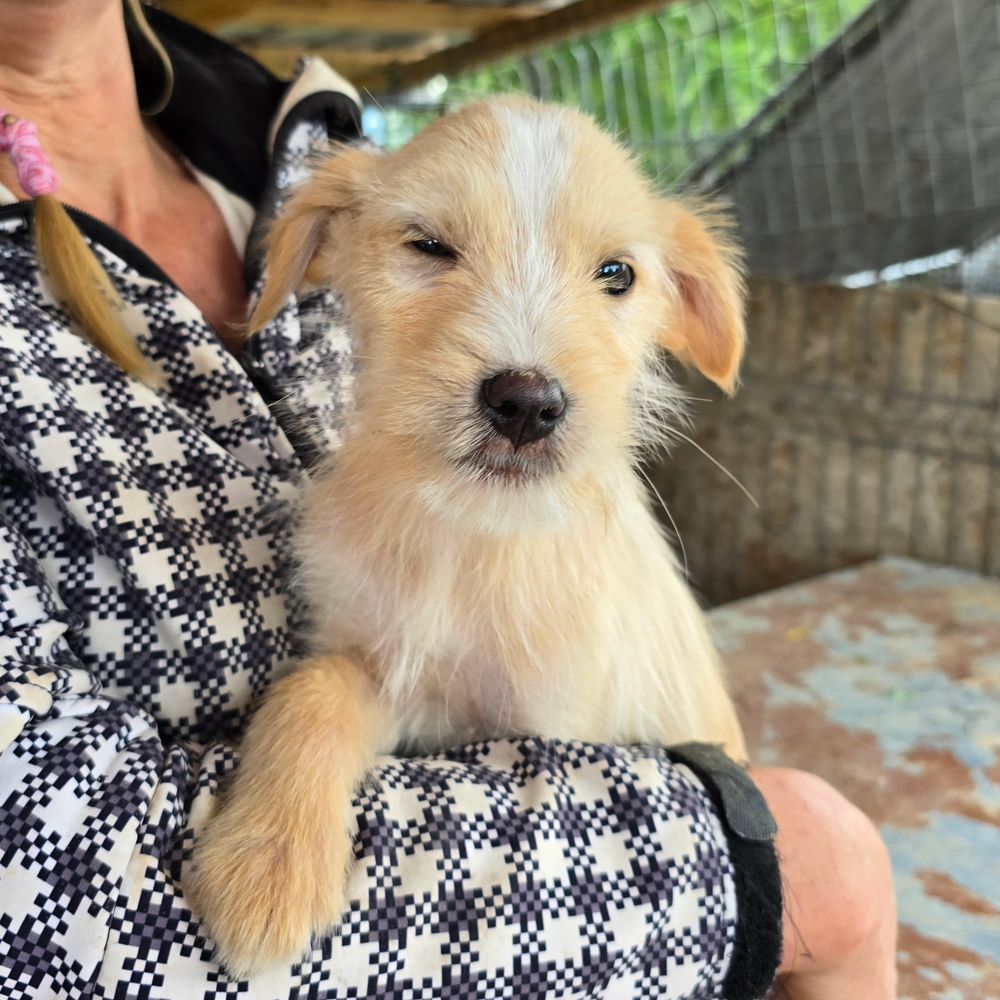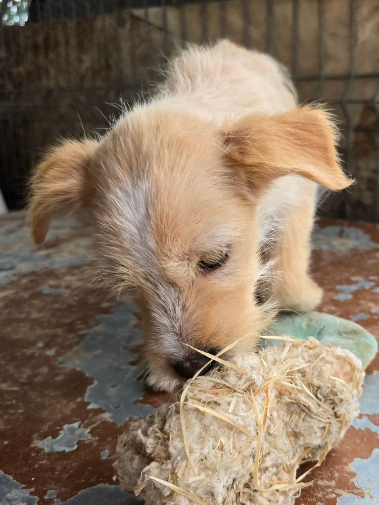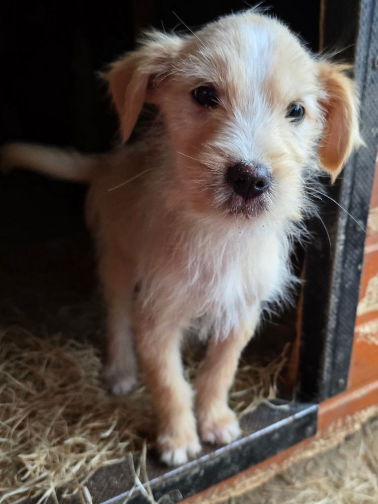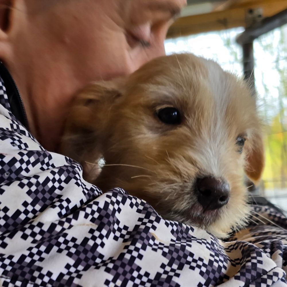 Dit knappe kereltje is gevonden in het bos, samen met nog een heleboel andere pups en een zogend teefje. We weten vrij zeker dat deze groep pups bestaat uit meerdere nestjes, dus kunnen we helaas niet met zekerheid zeggen of het zogende teefje zijn moeder is.
