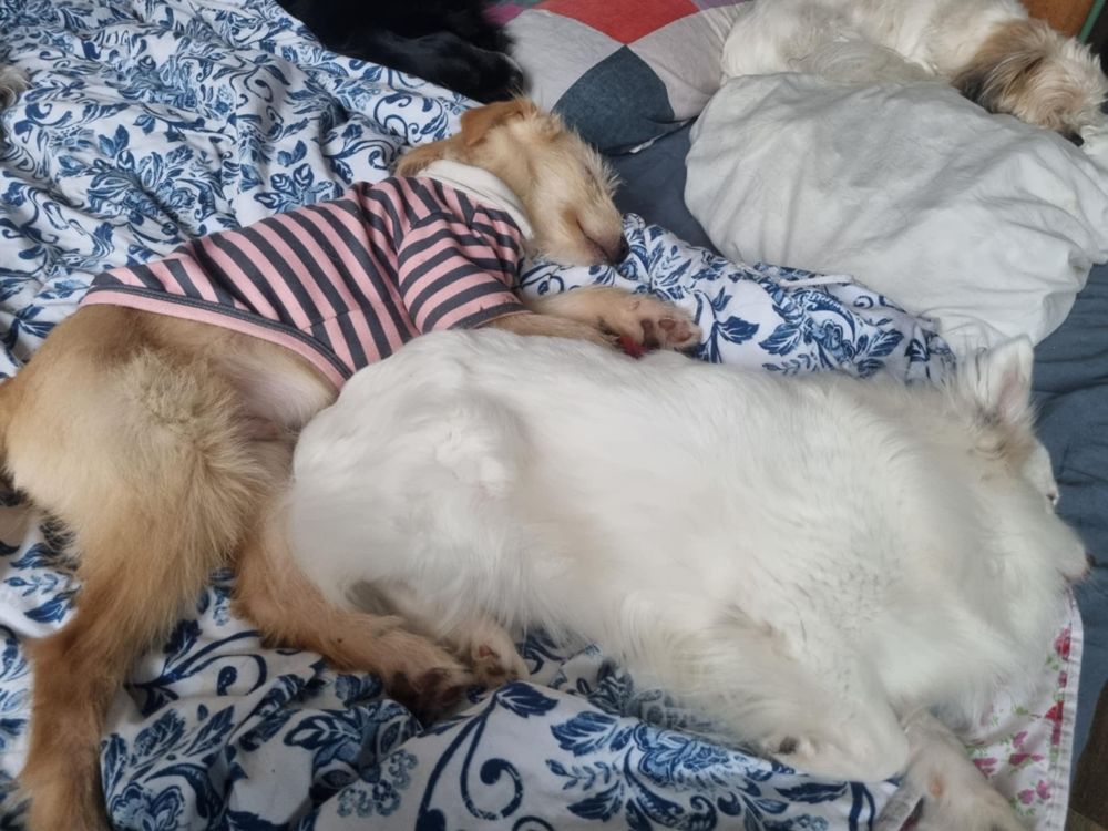 Lief 🥰 - het zwarte hondje, Bram, dat de eerste dag nog gromde, nu samen met Napoleon: