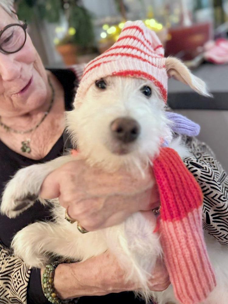 Af en toe even lekker knuffelen bij pleegmama op schoot, om het zootje van een hoger perspectief te onderzoeken. En ook de schoot en warme armen van (pleeg)oma mochten niet ontbreken. Had (pleeg)tante Anne een mutsje, shawl en wantjes voor me gebreid. Nou wat ik daar van vond… 🙄 aan mij niet besteed. Ik doorsta deze kou met vlag en wimpel, geen jasjes en dasjes voor mij!"