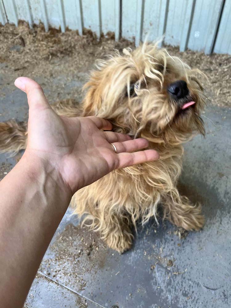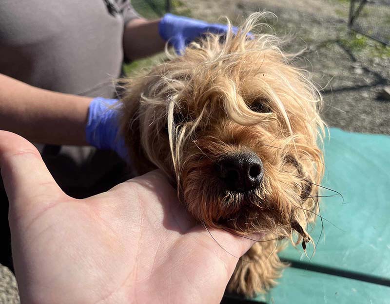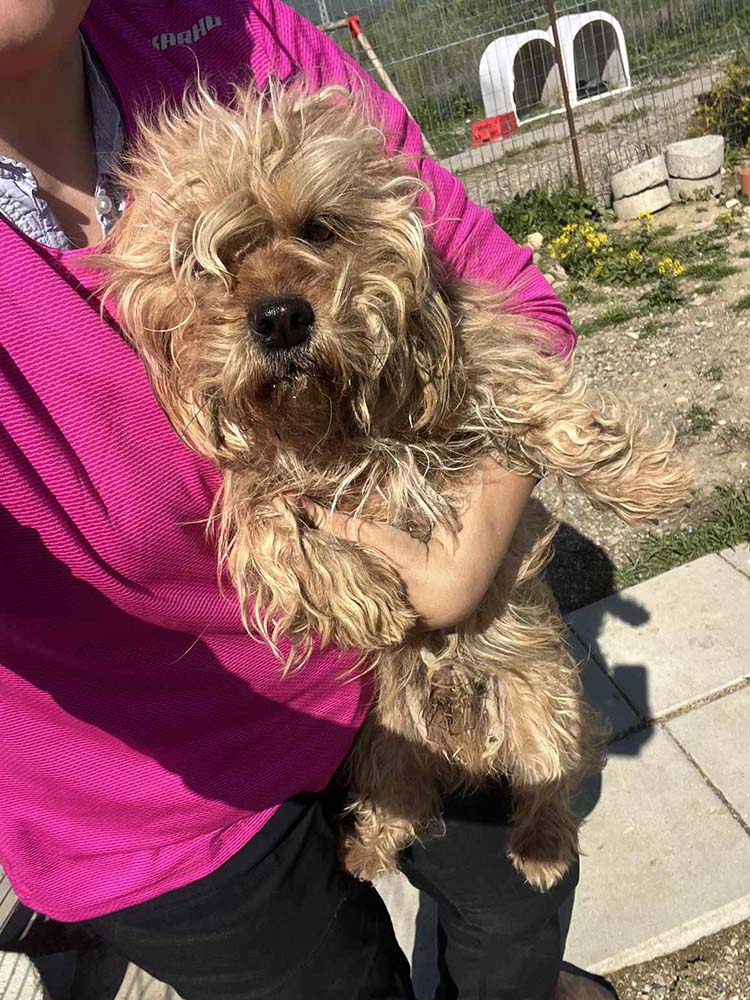 Natuurlijk heeft Elisa Rubio opgehaald en een veilig plekje in het asiel gegeven. Hij was in slechte conditie, te mager en met een vervilte en sterk vervuilde vacht. Bij Elisa's dierenarts heeft hij de hoognodige verzorging gekregen.