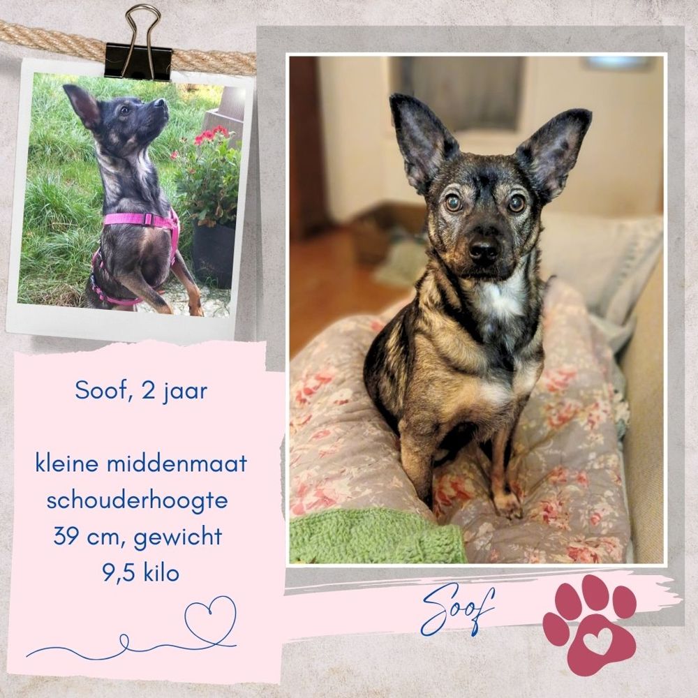 Soof is een aandoenlijk en nog jong hondje: ze is heel aanhankelijk, grappig en speels. Bij haar opvang in huis is ze vrolijk en een heerlijke knuffelkont. Wanneer je op bezoek komt, verwacht dan niet dat Soof je meteen vrolijk verwelkomd. Soof is eenkennig, het vraagt tijd en geduld om haar vertrouwen te winnen. Maar heb je dat gewonnen, dan geeft ze haar hartje ❤️ helemaal aan jou!