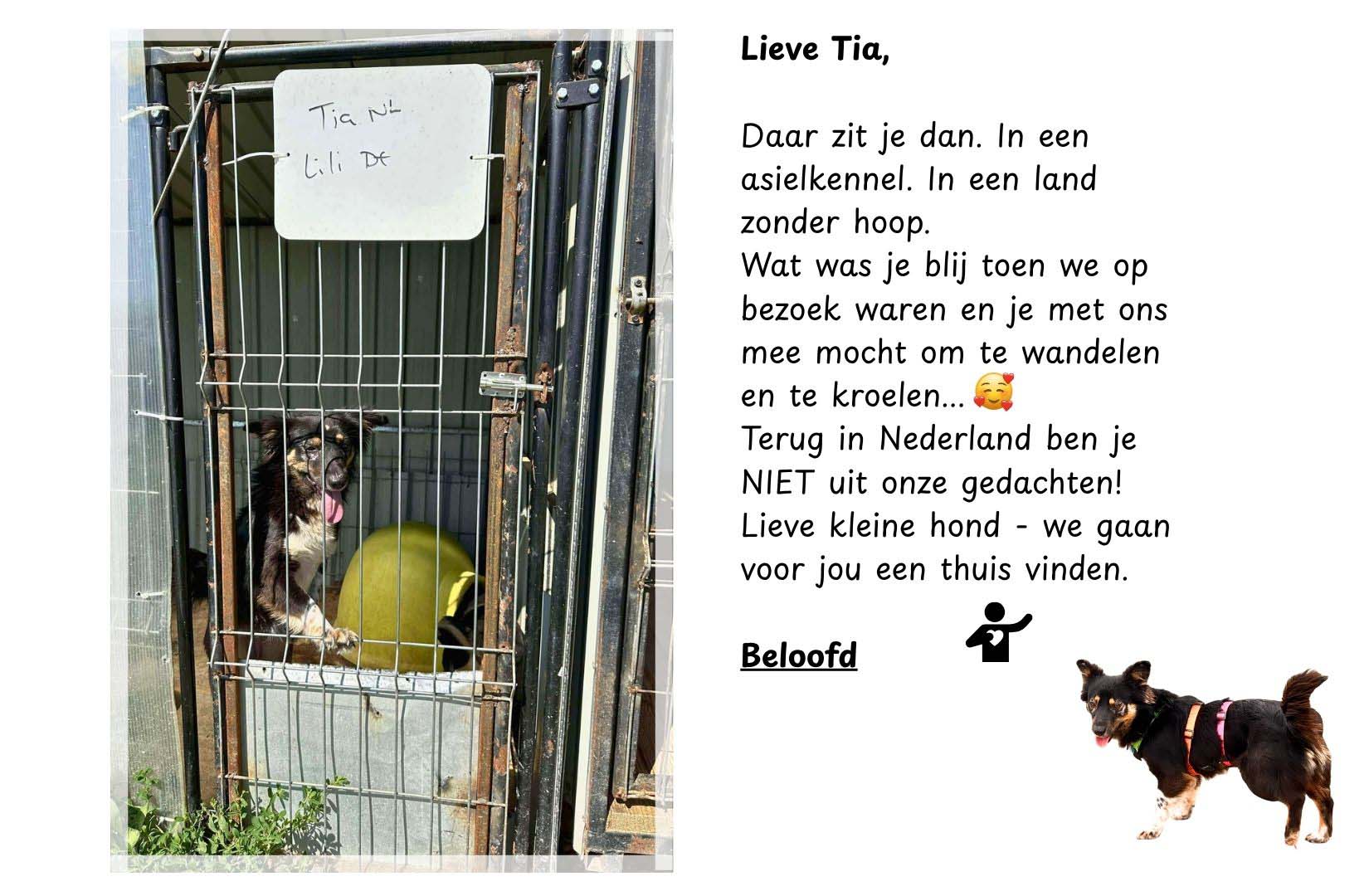 Lieve Tia is een "groot" hondje in een kleine verpakking. Ze is energiek en ontzettend vrolijk! Ze was maar wat blij om uit de kennel te komen en lekker aan de wandel te gaan met onze teamleden zoals je kunt zien in het filmpje "Kleine blije Tia". Met een duidelijke eigen wil is ze buiten nieuwsgierig en zelfstandig en vindt ze het heerlijk om lekker te snuffelen.