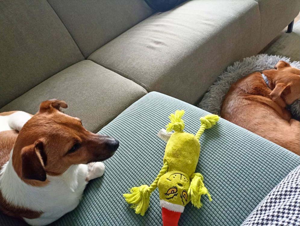 Ons eigen hondje Jolie kan gelukkig inmiddels veel meer Truffle verdragen, dit contact op de bank was voor het eerst leuk! Meestal vindt ze dat hij maar een hoop drukte maakt.😅