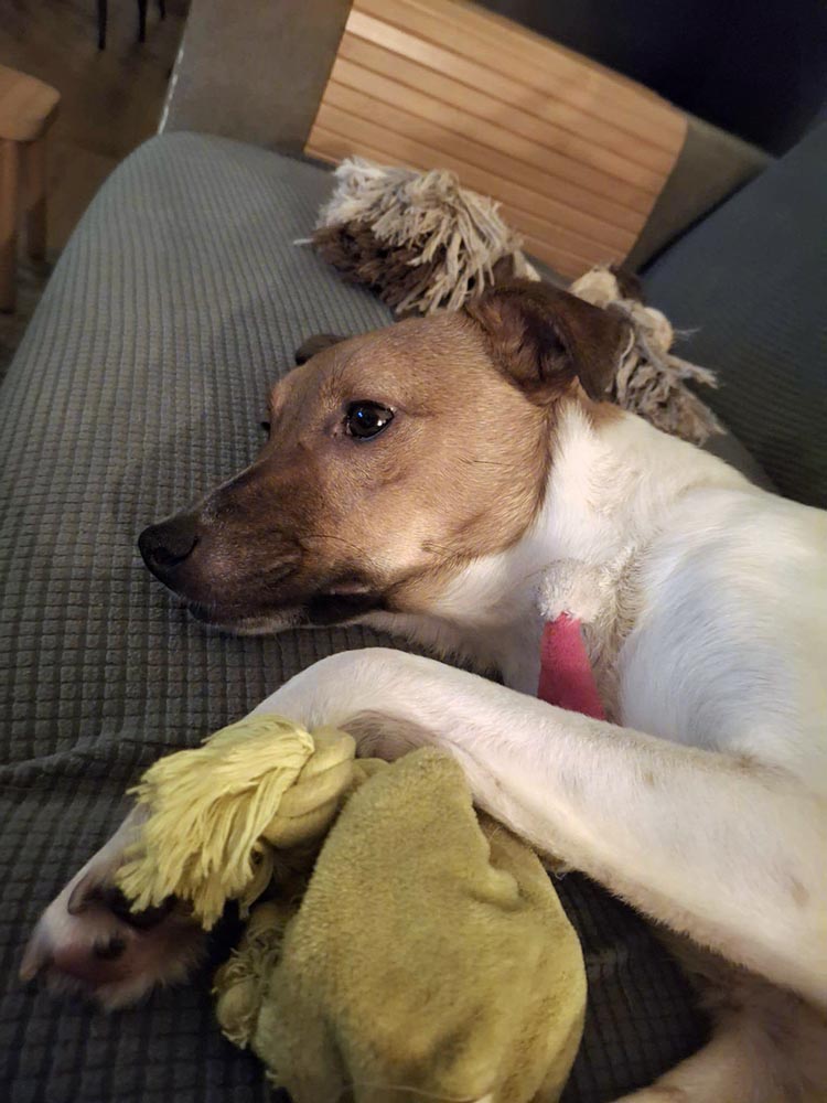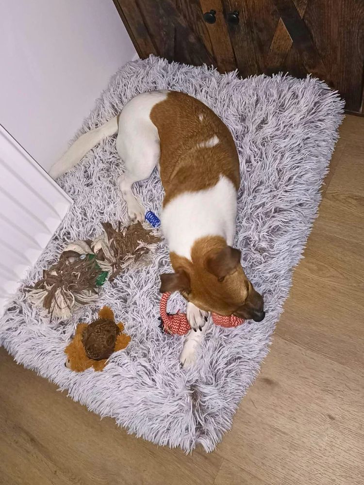 Aankomst in Nederland - Truffle's opvang schrjft, kort na zijn aankomst: "Truffle is gisteravond bij ons gekomen en wat vindt hij alles spannend. Onze eigen hond Jolie moet niks van 'm hebben, de kittens vinden hem machtig interessant en dat vindt hij allemaal prima 🥰 Truffle is heel vriendelijk en kan denk ik enthousiast zijn, maar nu zoekt hij vooral nabijheid bij ons. Hij kan nog niet op de bank springen, naar als ik hem daar op zet ligt hij heerlijk naast me en kan hij zijn rust vinden."