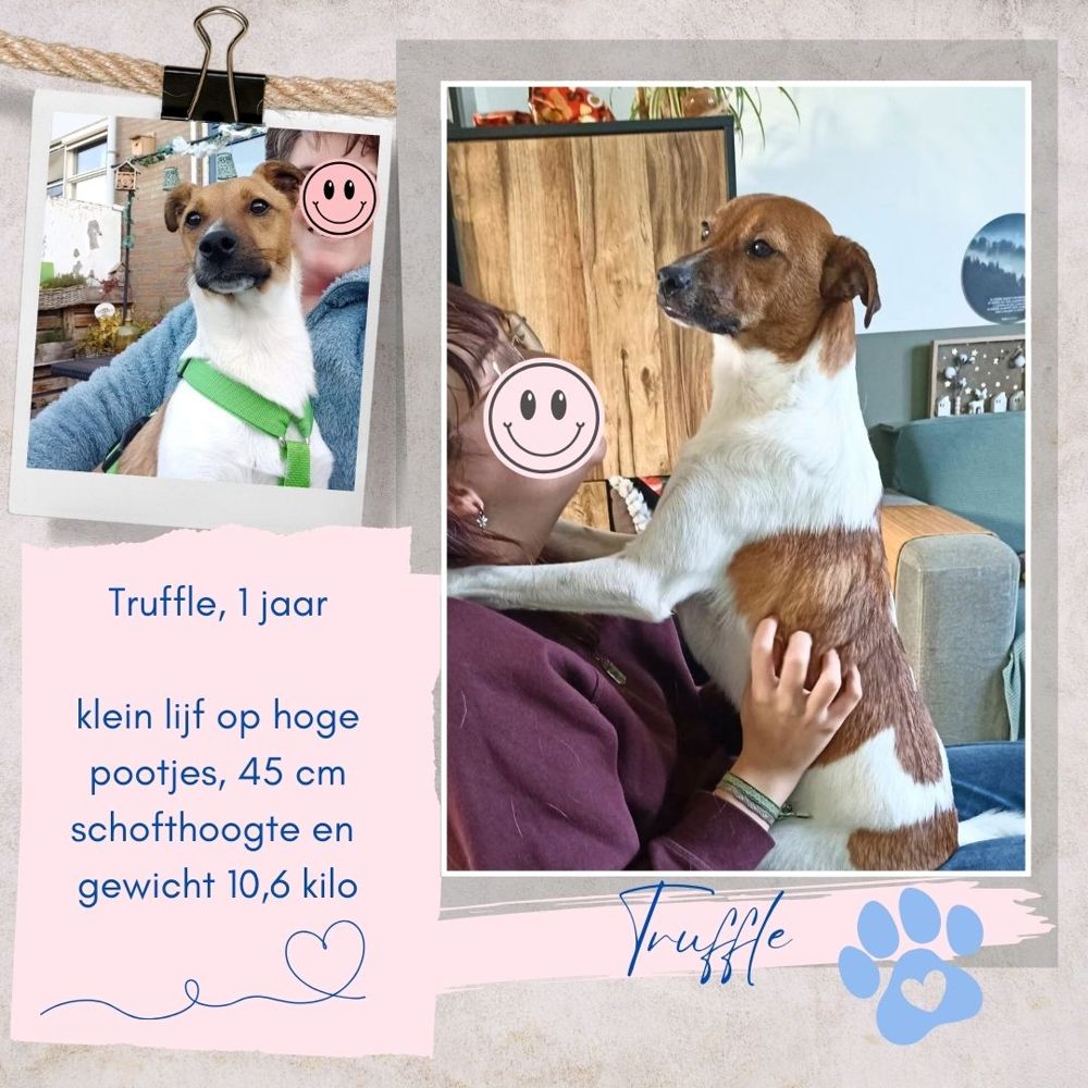 Truffle is een bijzonder lieve hond, heel zachtaardig en sociaal. Omdat hij is opgegroeid in een Roemeens asiel, heeft hij vanzelfsprekend nog tijd nodig om verder in te burgeren als huishondje in Nederland. Truffle verheugt zich op heerlijke wandelingen in de natuur, en samen met adoptant(en) bijvoorbeeld hersenwerk voor honden doen, spelen, kroelen en knuffelen!