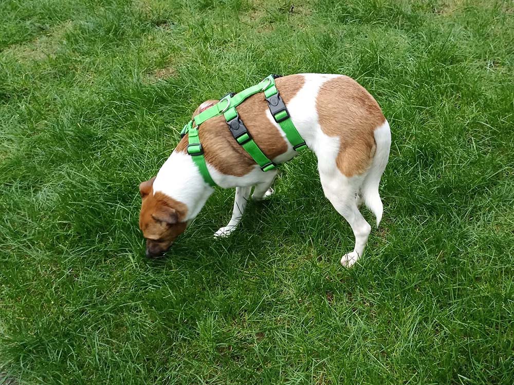 Het omkrijgen van het veiligheidstuigje vindt hij nog spannend, maar het gaat steeds beter. Net als het lopen aan een (lange) lijn; soms is het nog ingewikkeld om te weten waar het eind van de lijn is en hoe hij er niet in verstrikt raakt.