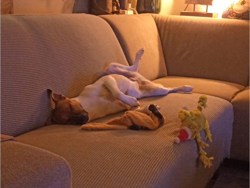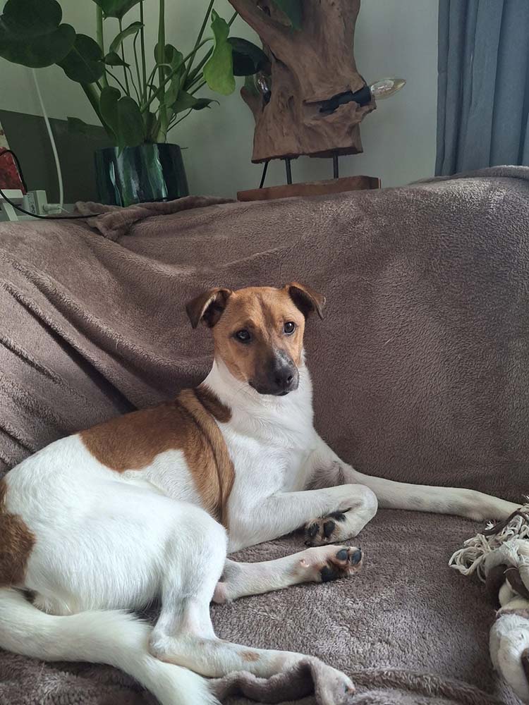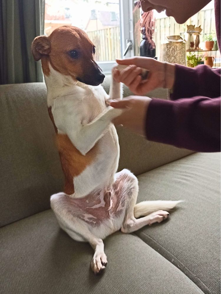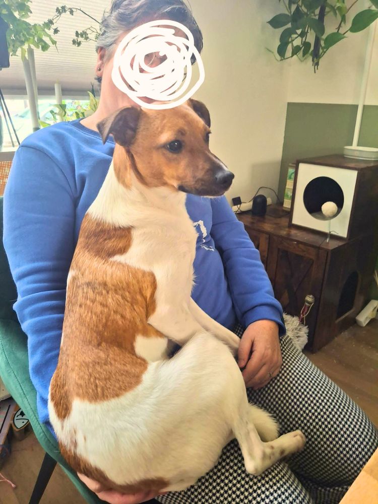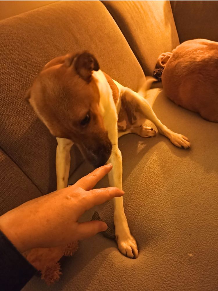 Aankomst in Nederland - Truffle's opvang schrjft, kort na zijn aankomst: "Truffle is gisteravond bij ons gekomen en wat vindt hij alles spannend. Onze eigen hond Jolie moet niks van 'm hebben, de kittens vinden hem machtig interessant en dat vindt hij allemaal prima 🥰 Truffle is heel vriendelijk en kan denk ik enthousiast zijn, maar nu zoekt hij vooral nabijheid bij ons. Hij kan nog niet op de bank springen, naar als ik hem daar op zet ligt hij heerlijk naast me en kan hij zijn rust vinden."