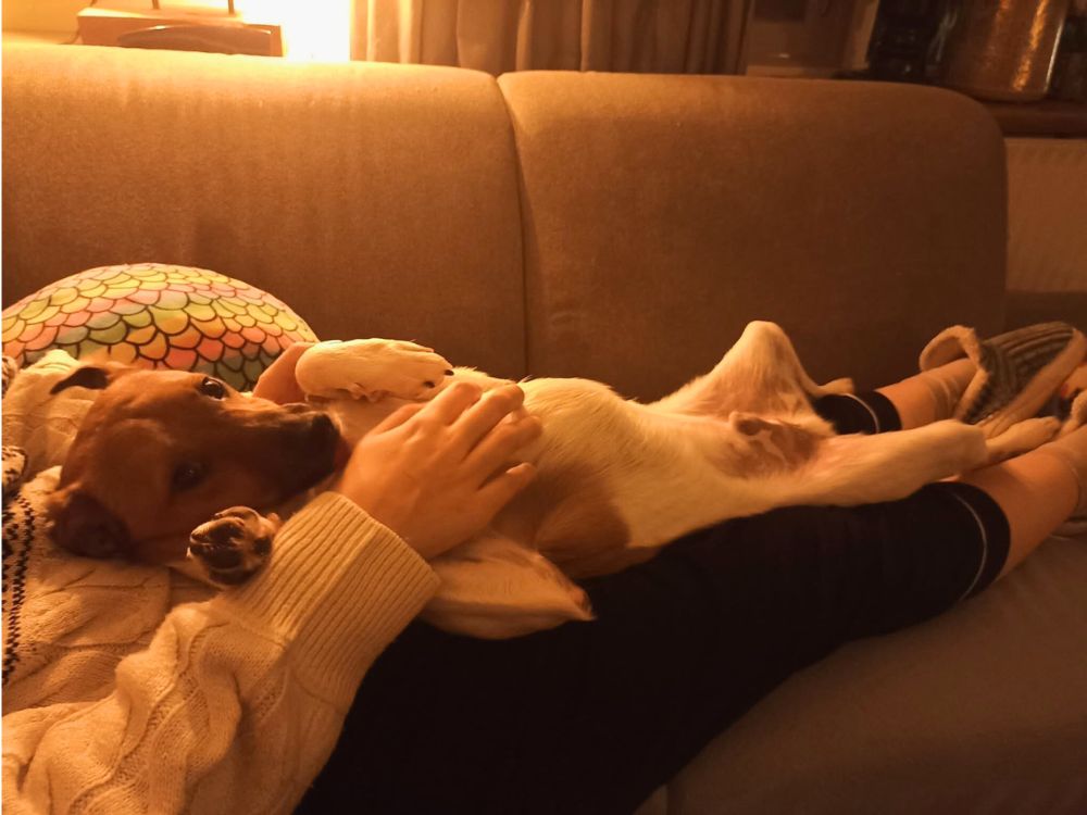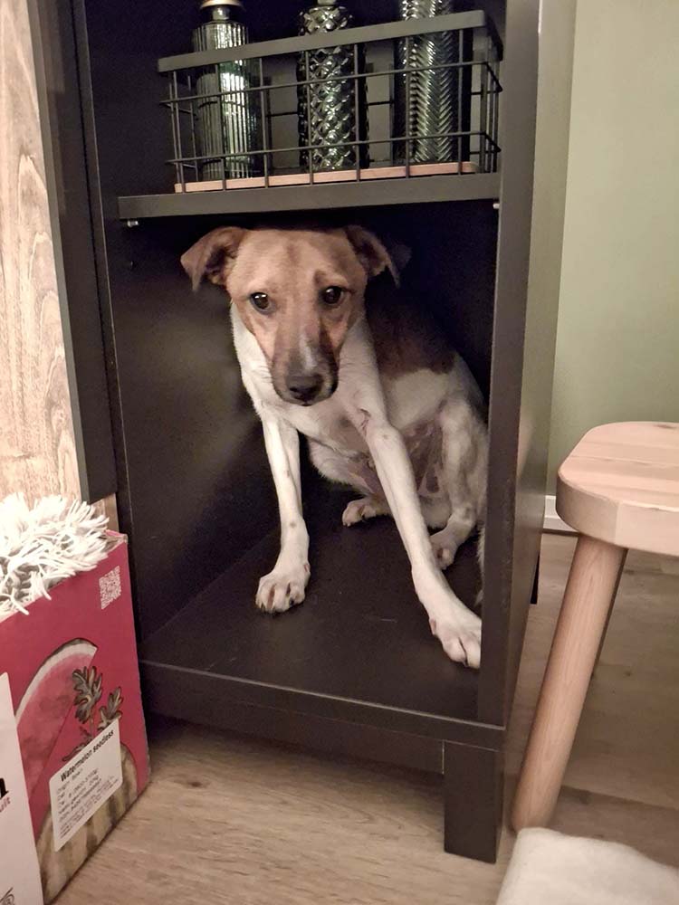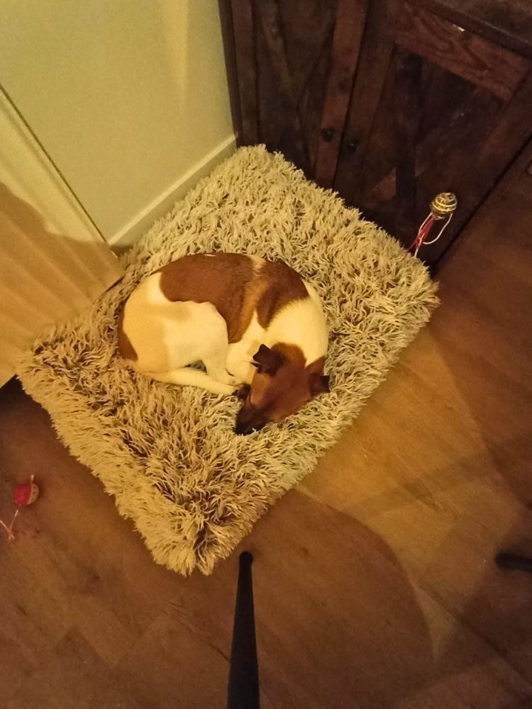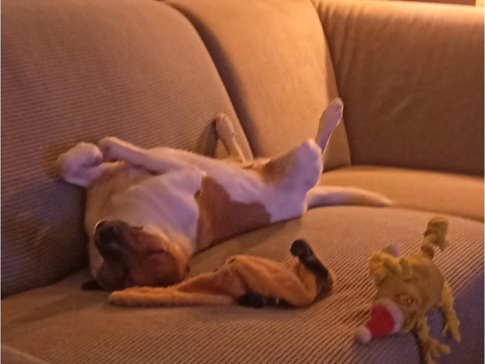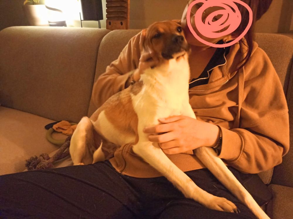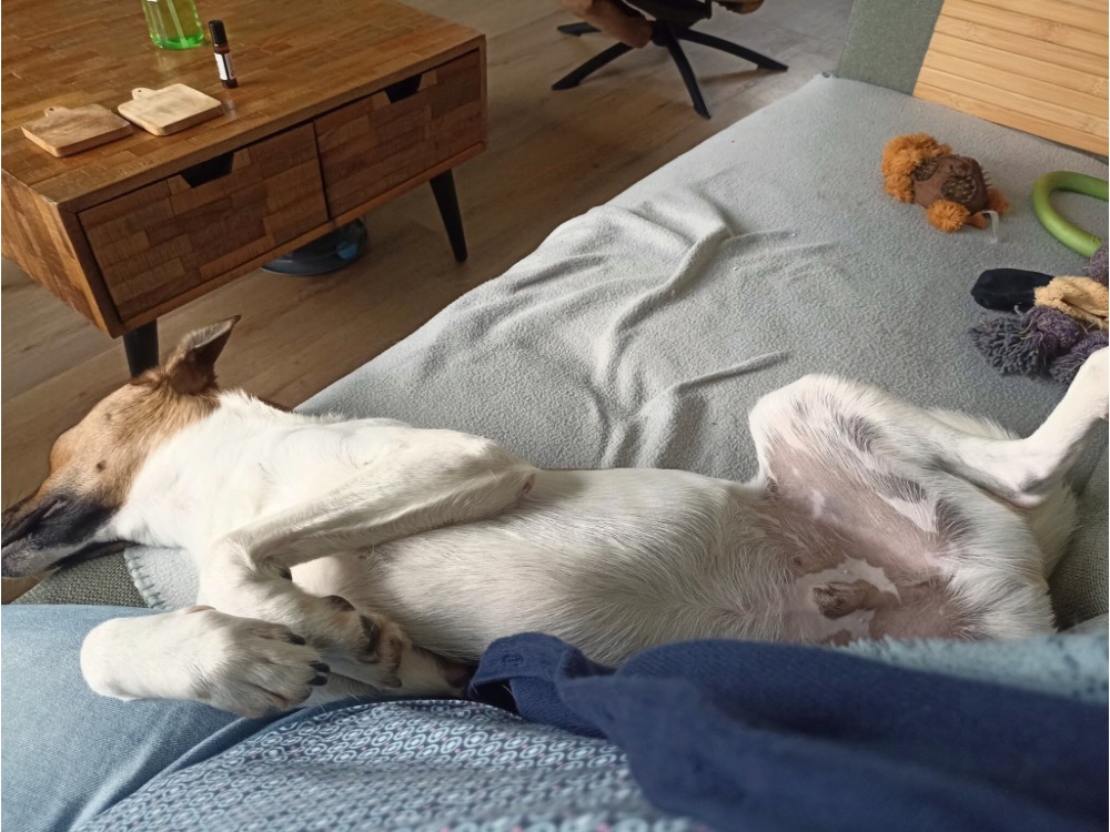 Aankomst in Nederland - Truffle's opvang schrjft, kort na zijn aankomst: "Truffle is gisteravond bij ons gekomen en wat vindt hij alles spannend. Onze eigen hond Jolie moet niks van 'm hebben, de kittens vinden hem machtig interessant en dat vindt hij allemaal prima 🥰 Truffle is heel vriendelijk en kan denk ik enthousiast zijn, maar nu zoekt hij vooral nabijheid bij ons. Hij kan nog niet op de bank springen, naar als ik hem daar op zet ligt hij heerlijk naast me en kan hij zijn rust vinden."