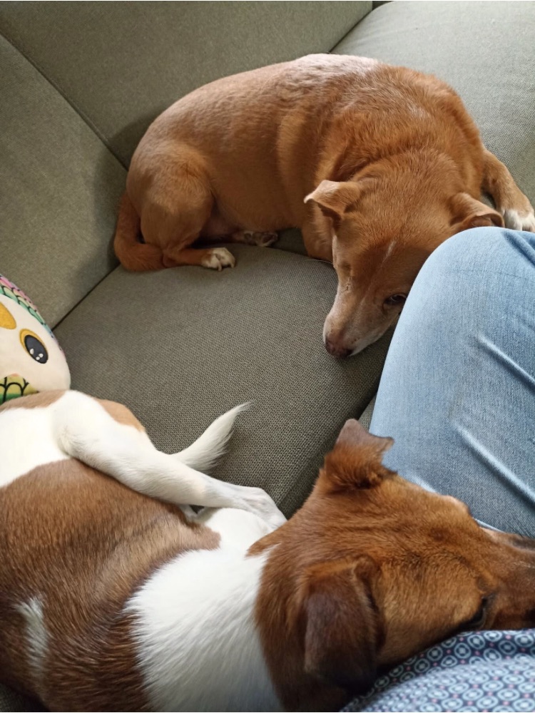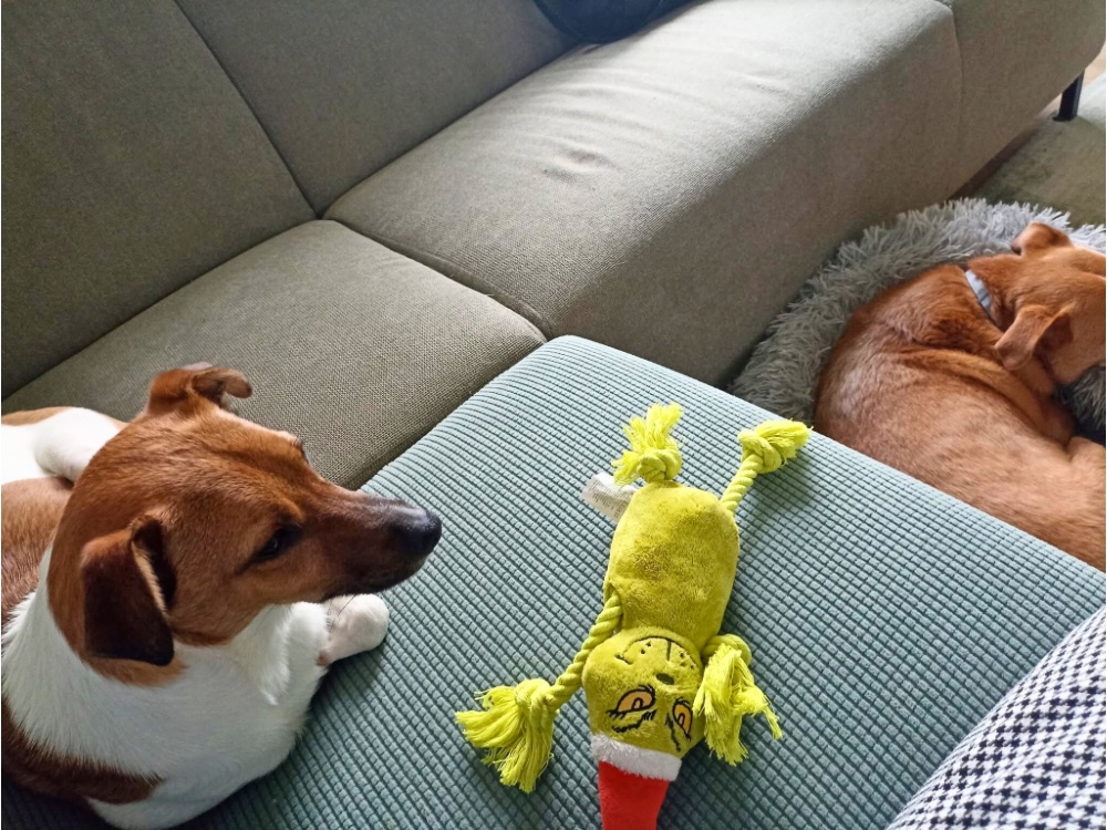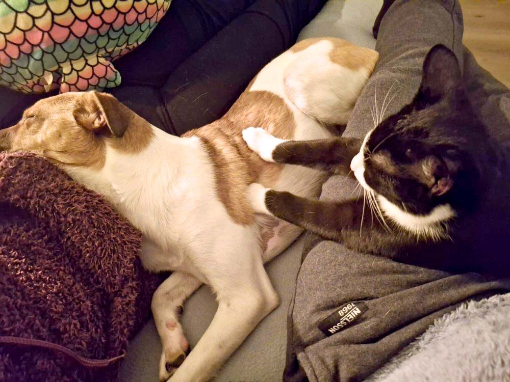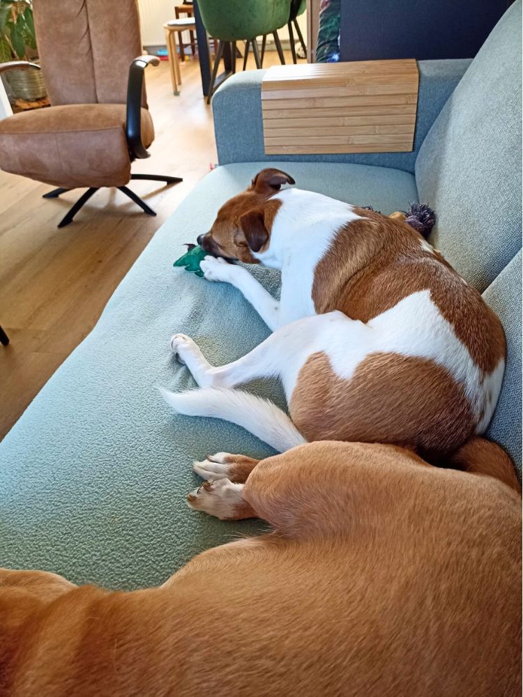 Truffle is heel sociaal naar de andere hond in het gastgezin en ook naar de kittens. De katjes mogen gerust bovenop hem liggen op de bank 🥰