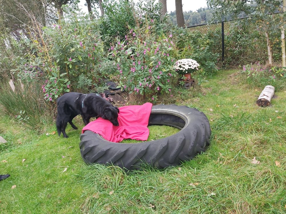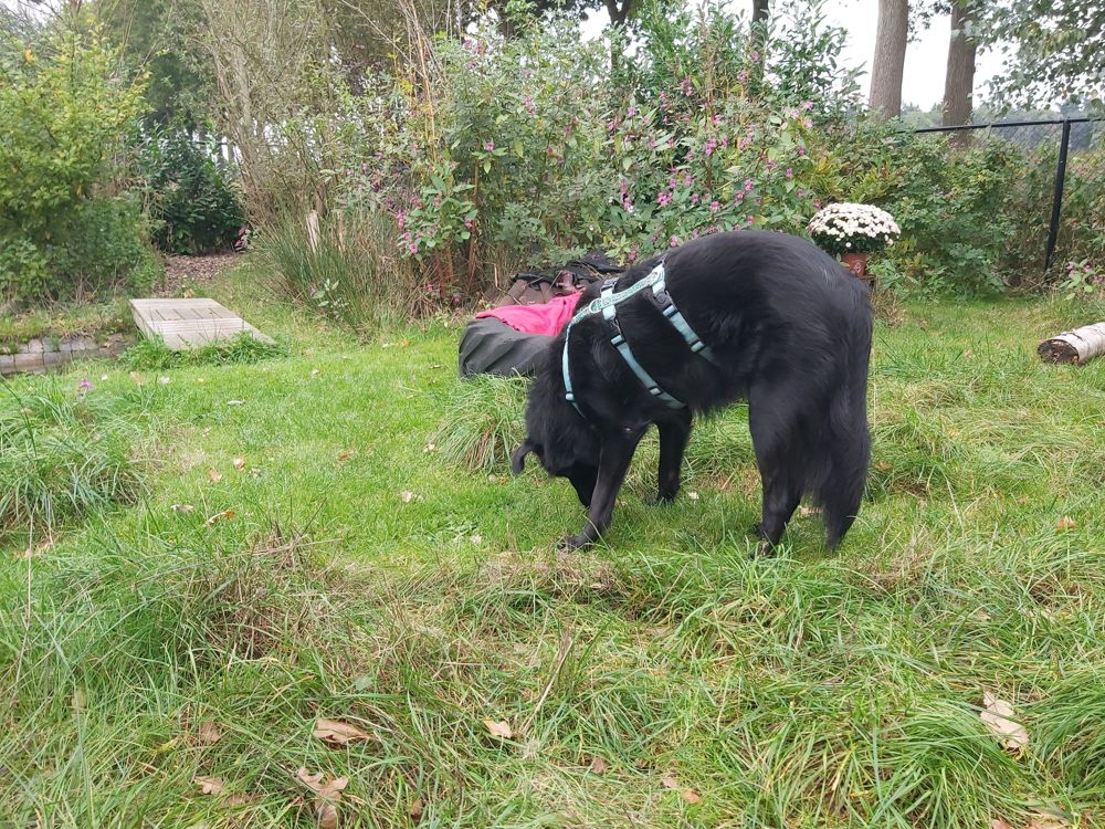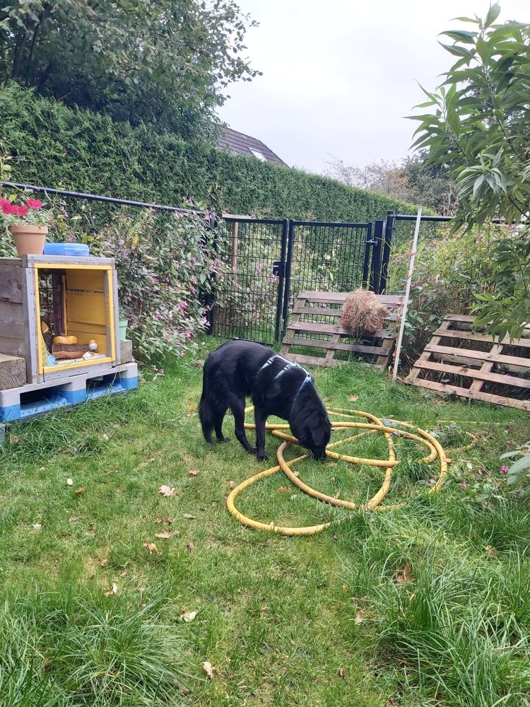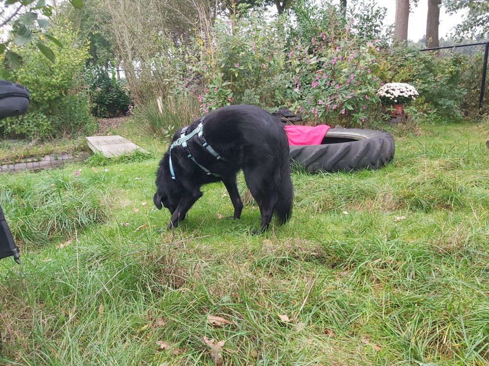 Buiten gaat hij altijd even een stukje rennen en spelen met zijn speeltjes. Ook hier kan hij na een poosje prima de rust vinden, als hij klaar is met zijn activiteiten.