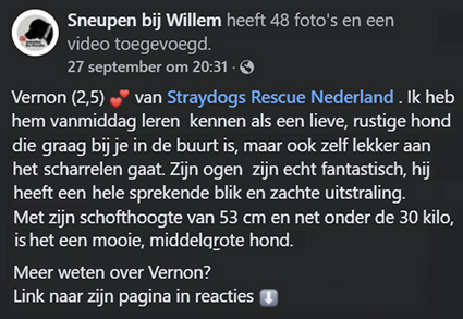 27 september 2025 mocht deze mooie man gebruik maken van de snuffeltuin "Sneupen bij Willem" waar hij zijn neusje heerlijk de kost mocht geven. Sneupen is Fries voor snuffelen, struinen, speuren, ontdekken… En dat is precies wat Vernon heeft gedaan. In het album hieronder zijn al leuke foto's te vinden van dit bezoek, maar in dit album op de facebookpagina van Sneupen bij Willem zijn nog veel meer foto’s en video’s te vinden.