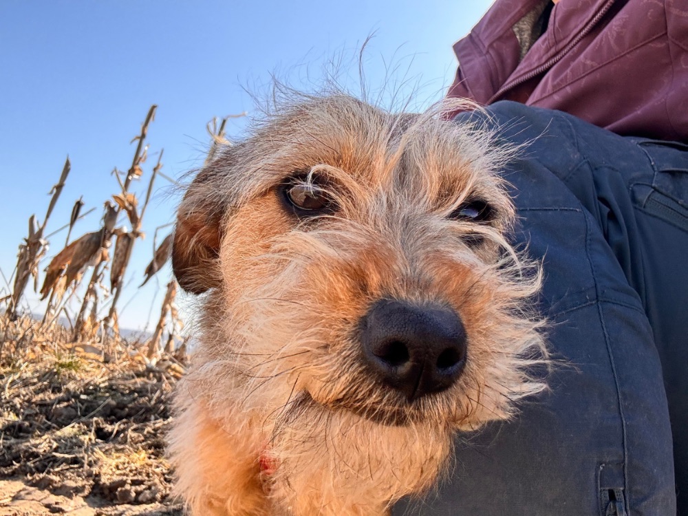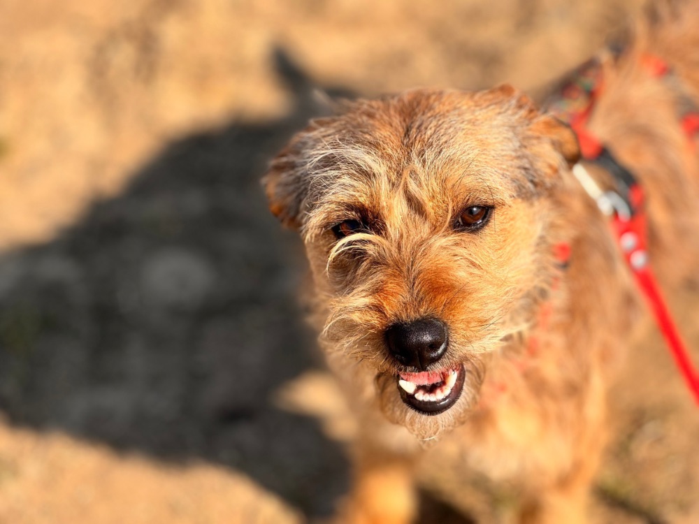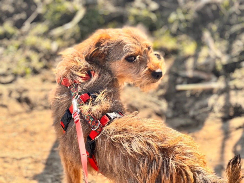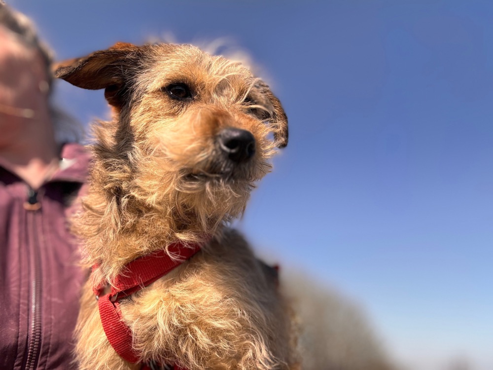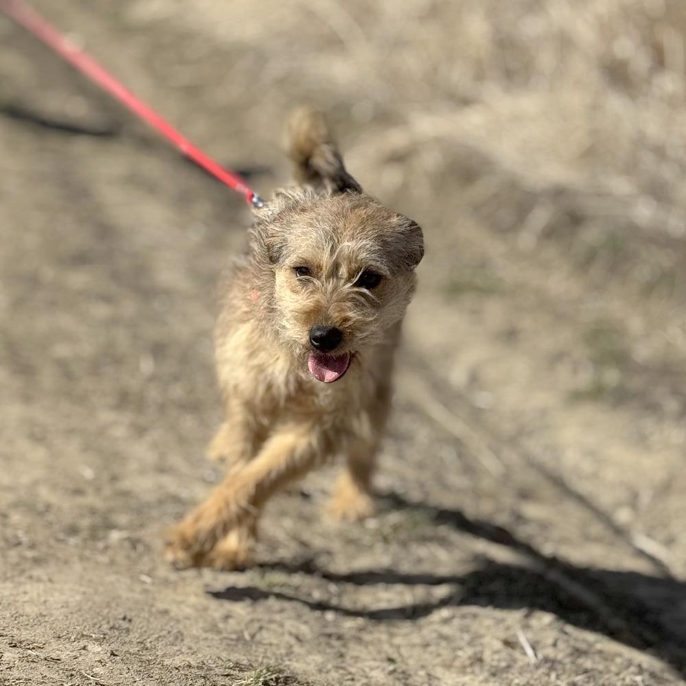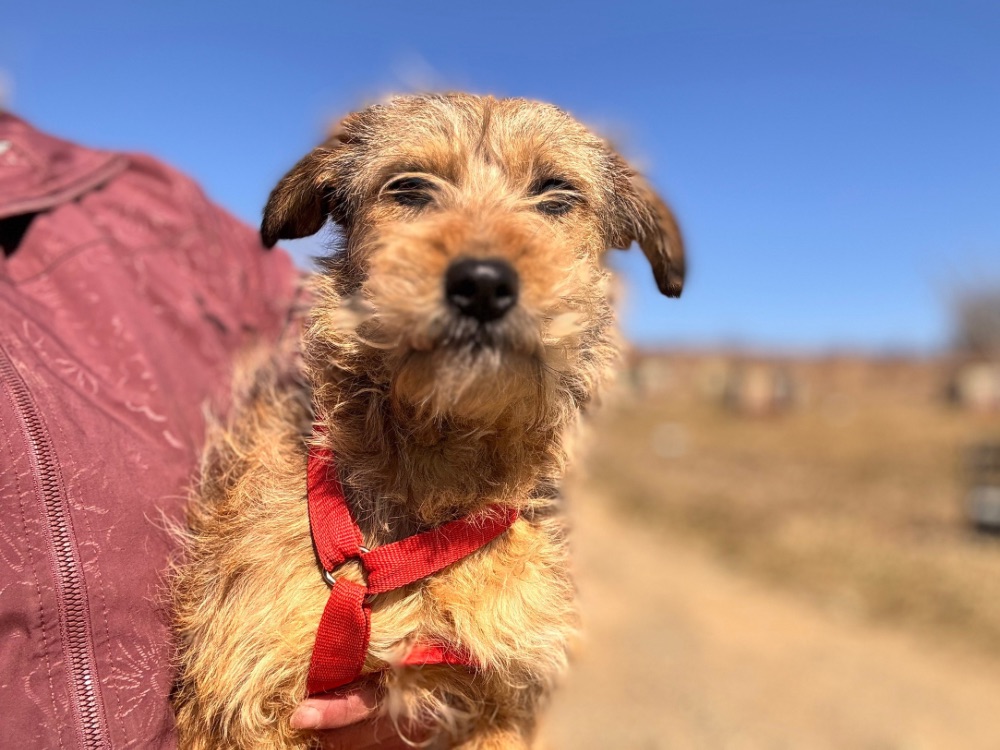 We verwachten dat dit leuke teefje klein zal blijven, of hooguit zal opgroeien tot een kleine middenmaat. Welke rassen er in haar (voor)ouders vertegenwoordigd zijn, is onbekend, dus de uiteindelijke grootte blijft een schatting. Ze lijkt wel wat op een Border Terriër, ook qua formaat en bouw.