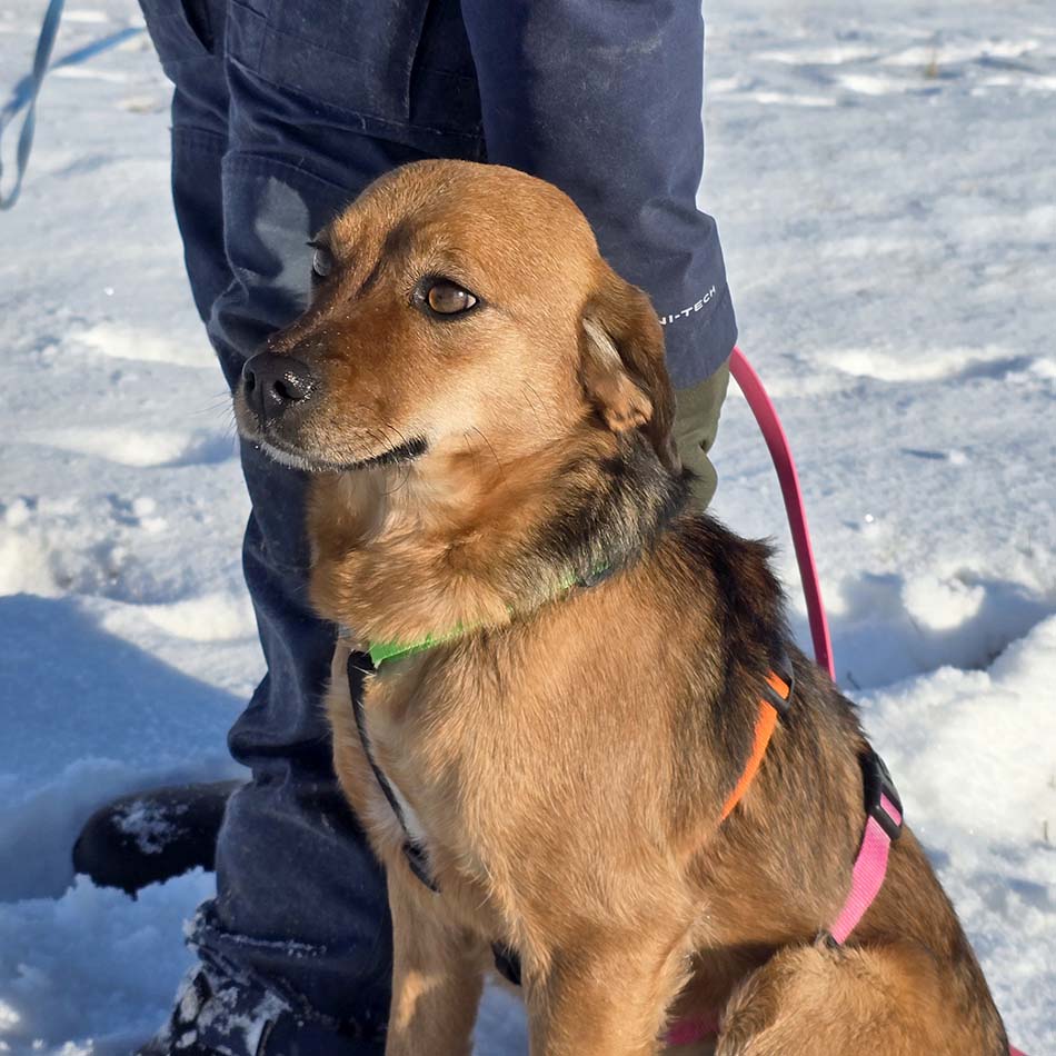 Dit lieve meisje is een heerlijke kroelkip, ze zou wel de hele dag geknuffeld willen worden. Wandelen vindt ze leuk, ze moet alleen nog wel een cursusje goed aan de lijn lopen hebben, want ze kan nu nog wat springerig zijn. Nieuwe situaties vindt ze nog spannend wat niet zo gek is als je bedenkt waar ze vandaan komt.